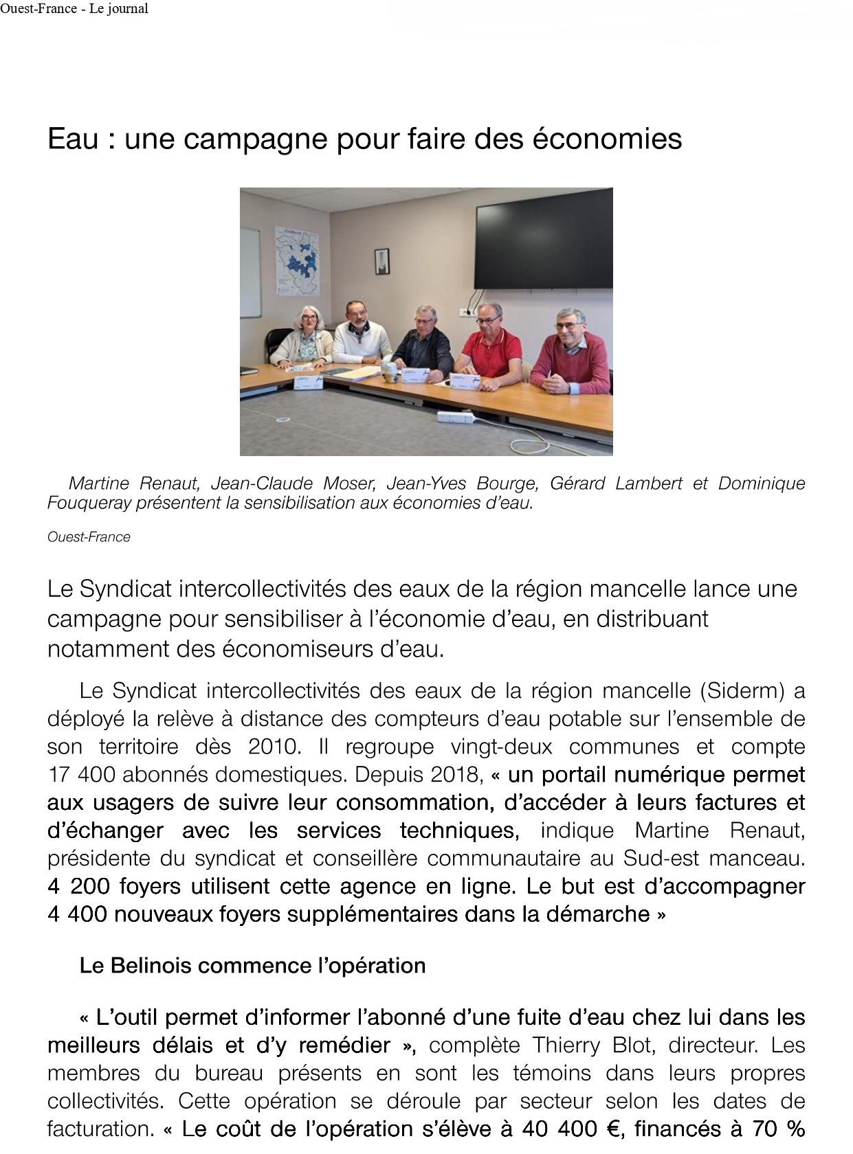 Le SIDERM poursuit la modernisation de sa gestion de l’eau potable et renforce ses actions en faveur d’une consommation responsable. Depuis l’automne 2025, une campagne est déployée dans les 23 communes de son territoire pour inciter les abonnés à s’inscrire sur l’Agence en ligne, le portail numérique dédié aux usagers. Une conférence de presse s'est tenue au SIDERM le 07 octobre dernier.